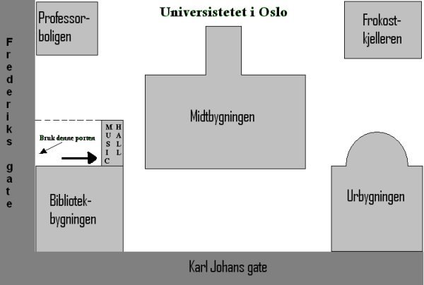Lokalet vårt “Music Hall” befinner seg i Kattestallen som ligger bak det juridiske bibliotek med inngang fra Fredriksgate. Addressen er Karl Johans gate 47.
